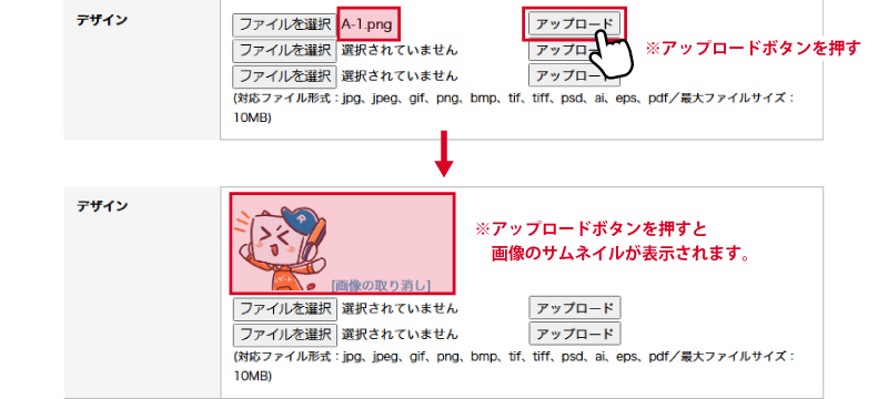 【デザイン入稿フォームから入稿の場合】デザインをアップロードする際は、ファイルを選択で選択後必ずアップロードボタンを押してください。