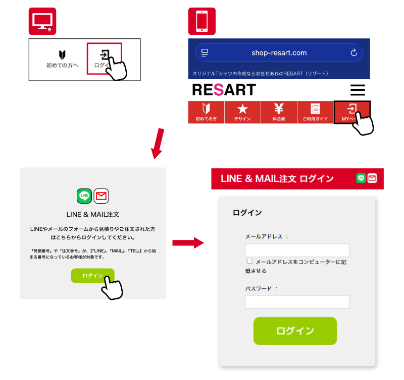WEBサイトのログインボタンから『LINE&MAIL注文ログイン』からログインを行ってください。