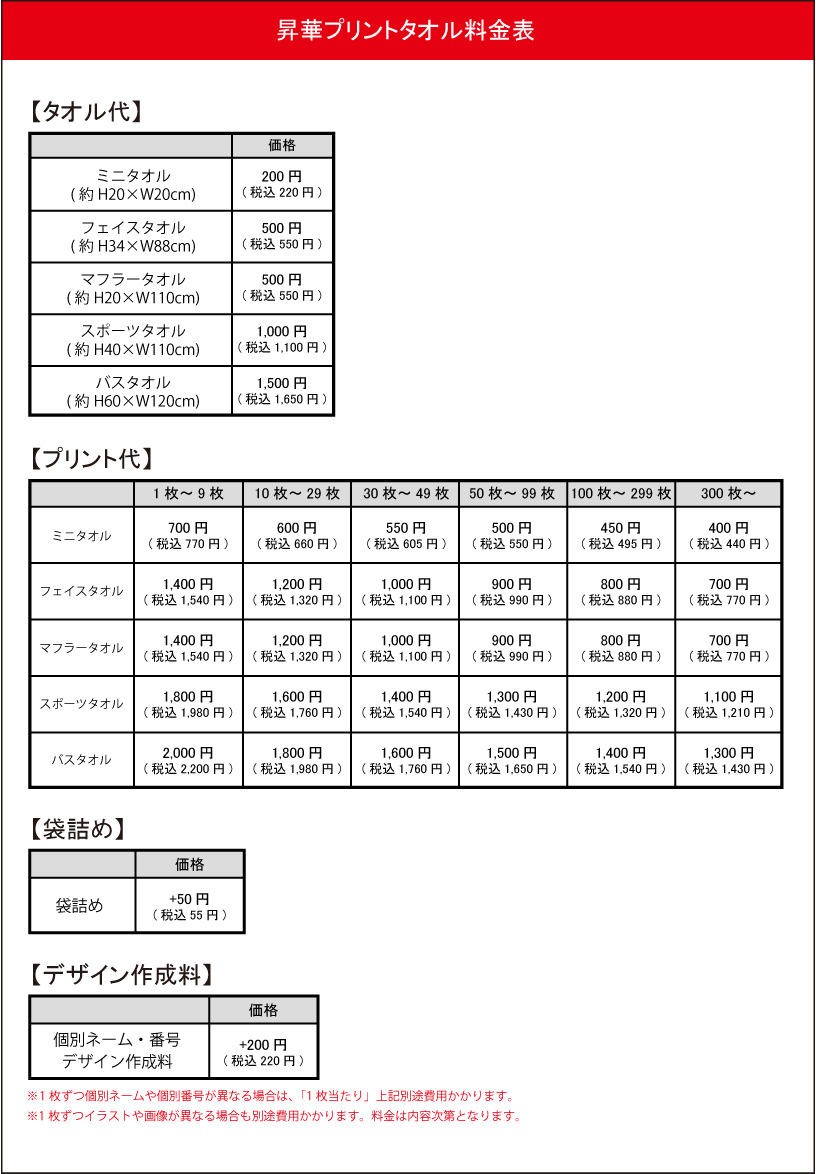 タオルの生地が異なる場合は金額が変わりますのでお問い合わせください。 - 1枚ずつ個別ネームや個別番号が異なる場合は、「1枚当たり」にデザイン作成料がかかります。