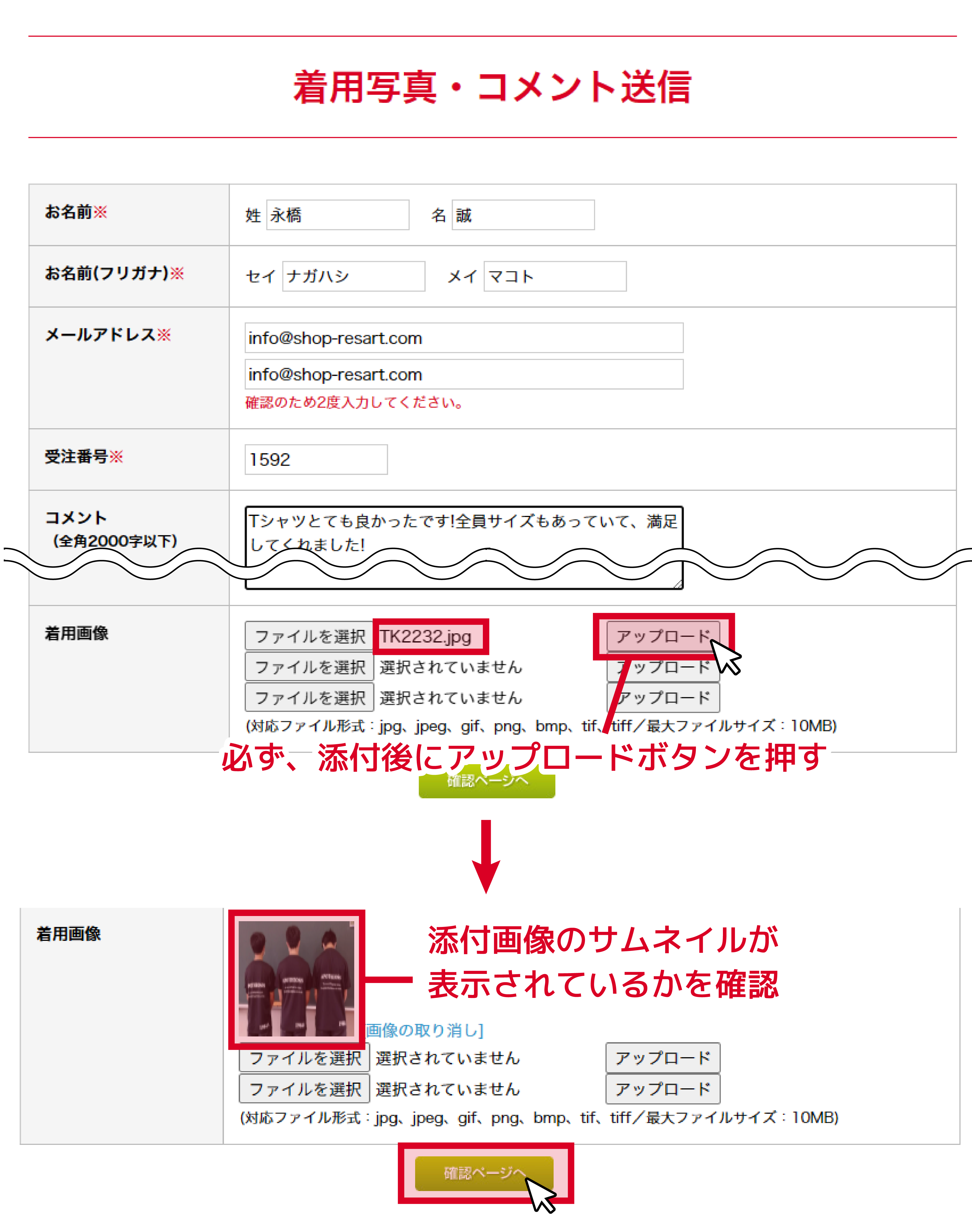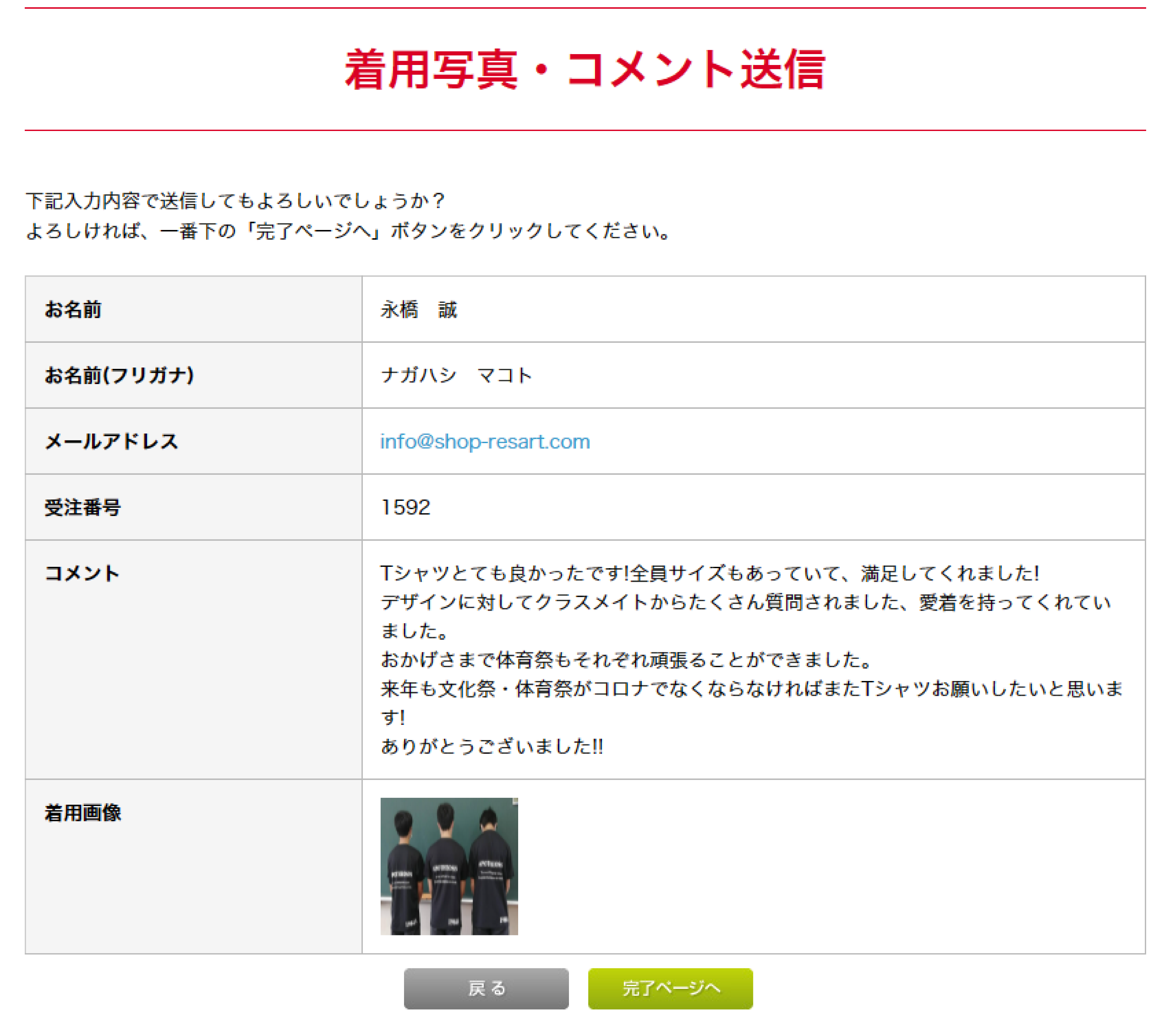 お名前・受注番号・コメントを記載し、着用写真を添付してください。